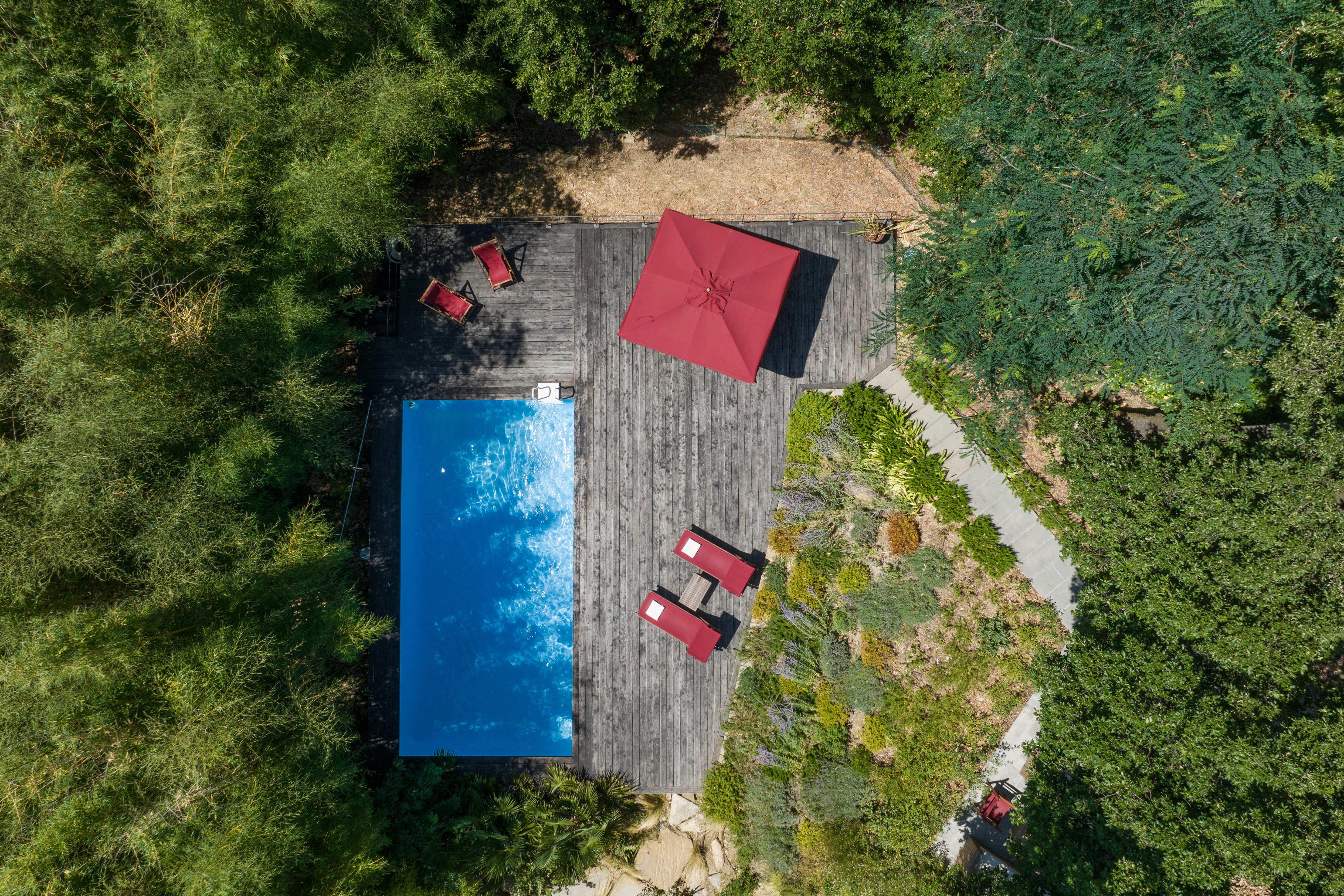 The beautiful, fully fenced private park and the pool, surrounded by nature, provide ideal spaces to relax and enjoy a peaceful holiday. The pool area, framed by a tall bamboo grove with an exotic feel, is reached through the garden and offers both sunny lounges and shaded areas.